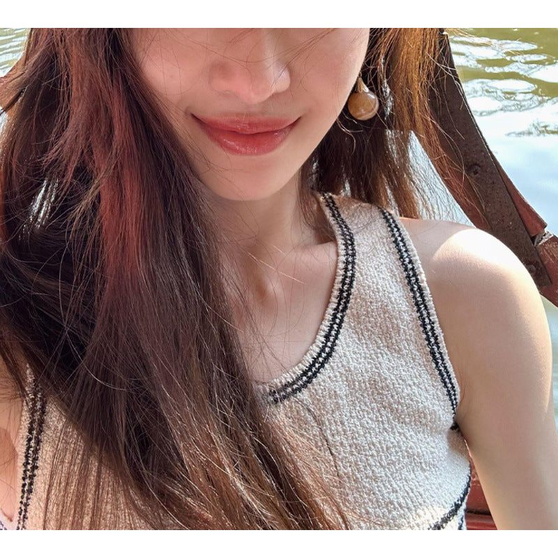 This knitted vest skillfully combines the chic tweed style with an artistic feel. Made of textured knitted fabric, it has fine texture, soft and skin - friendly touch, as well as good air permeability and elasticity, ensuring comfortable wearing. The classic sleeveless design shows the beautiful shoulder and neck lines, suitable for various seasons and wearing scenarios. It can be worn alone for a casual look or as an inner layer for layering to add dimension. The contrast stripe element, with black and white lines outlining the garment's silhouette, is simple yet exquisite, full of retro charm, easily creating a fresh, artistic or slightly mature and fashionable style.