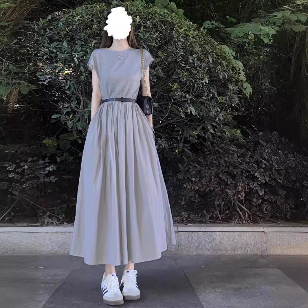 This dress cleverly combines knitted and cotton fabrics to create a unique style. The upper part uses soft knitted fabric, which is skin - friendly, comfortable and fits the body shape. The crew neck with sleeveless design is simple and generous, showing a fresh summer feel. The lower part is spliced with a cotton flared skirt, which has good drape and naturally spreads out to create a casual and artistic atmosphere. The waist - cinching cut emphasizes the waistline, optimizes the body proportion, and suits various body shapes. It is suitable for daily commuting, outdoor strolling and other scenarios. The light gray tone is soft and versatile. It can be paired with a belt to add styling layers or worn alone to show a relaxed feel, easily capturing the casual and artistic style, injecting fresh vitality into the wardrobe.